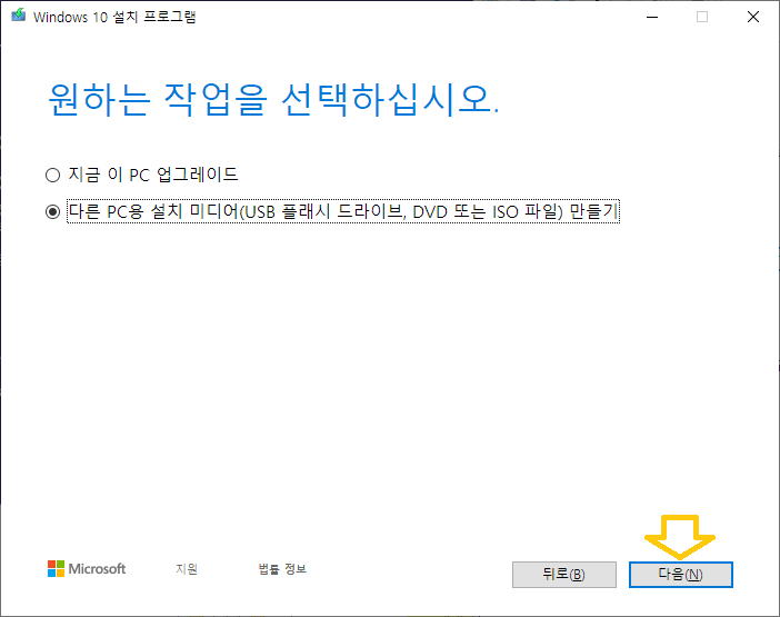 '다른 PC용 설치 미디어 만들기' 를 클릭하고 다음을 누른다.