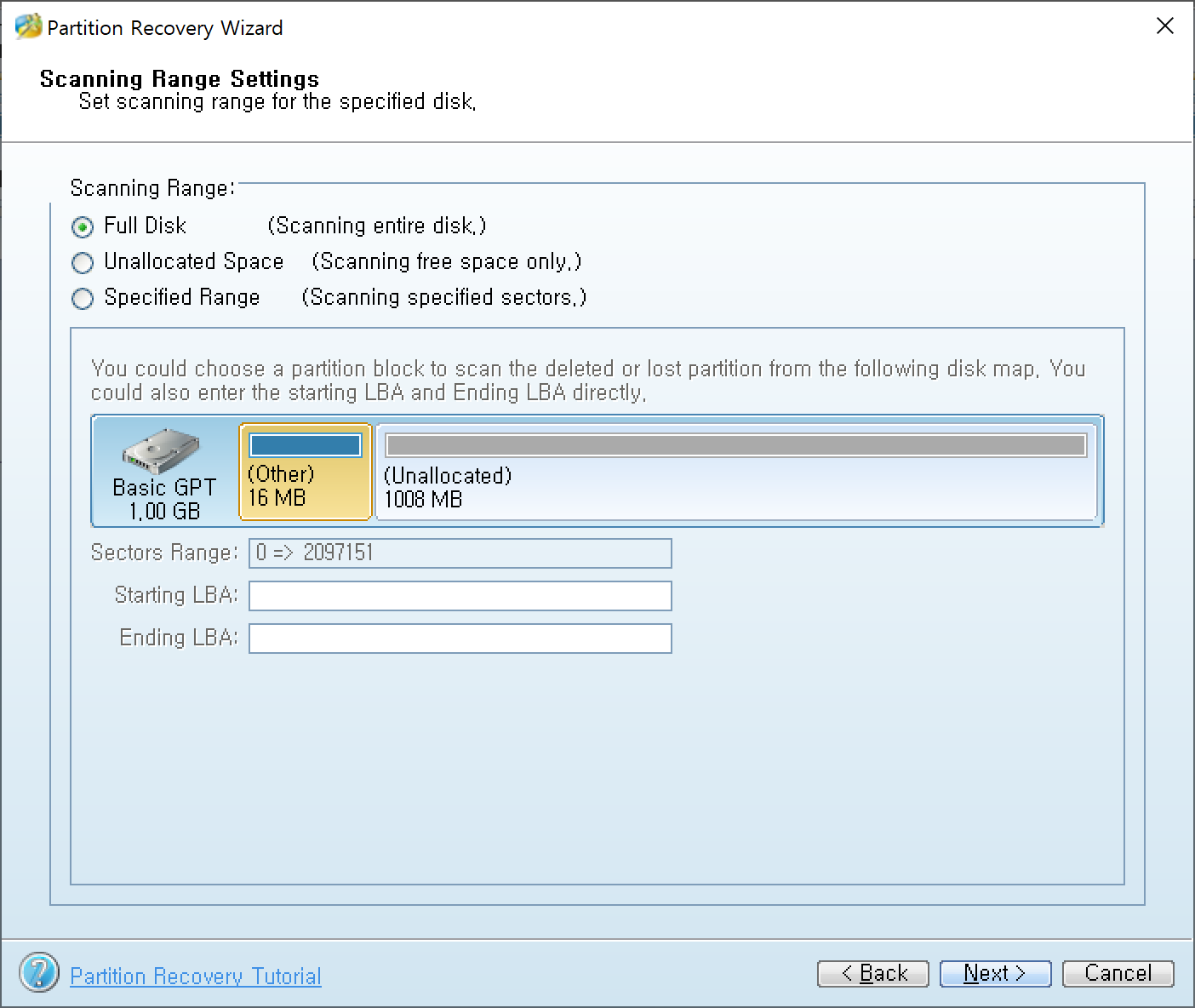 스캔 범위 선택. 실수로 파티션을 삭제한 후 다시 파티션을 만든 게 아니라면 Unallocated Space로 충분하다.