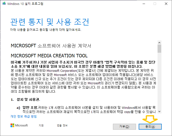 프로그램을 실행하고 프로그램 사용권을 자세히 읽은 후 동의한다면 동의 버튼을 눌러 진행한다.