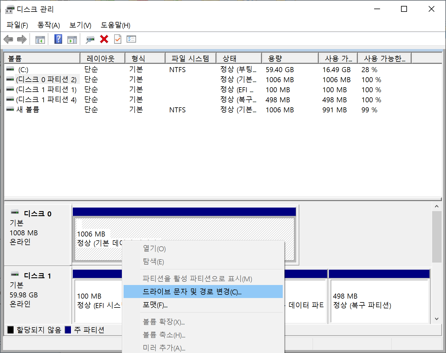 복구 한 파티션 선택, 우클릭, 드라이브 문자 및 경로 변경