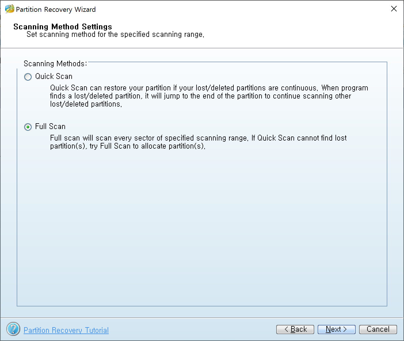 스캔 방식 선택. 마찬가지로 실수로 파티션을 지운 후 다시 파티션을 만들지 않았다면 Quick Scan을 선택하면 된다.