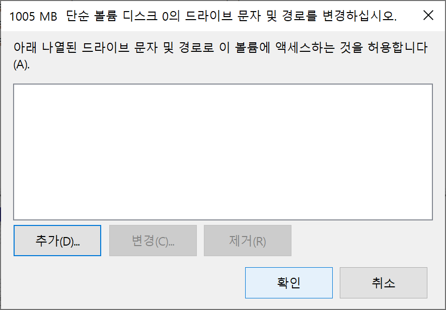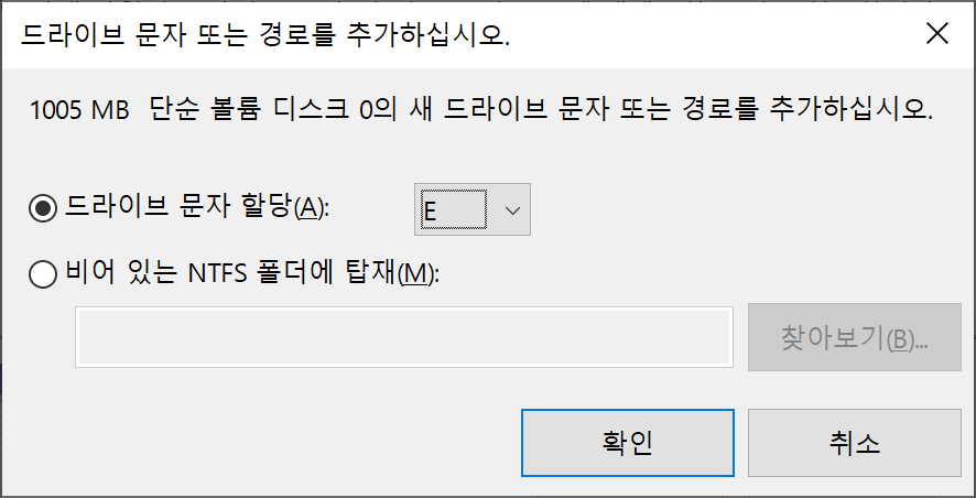 원하는 드라이브 문자 할당. 보통 C부터 순서대로 할당되므로 특별한 경우가 아니면 바로 '확인'을 클릭하여 저장하면 된다.