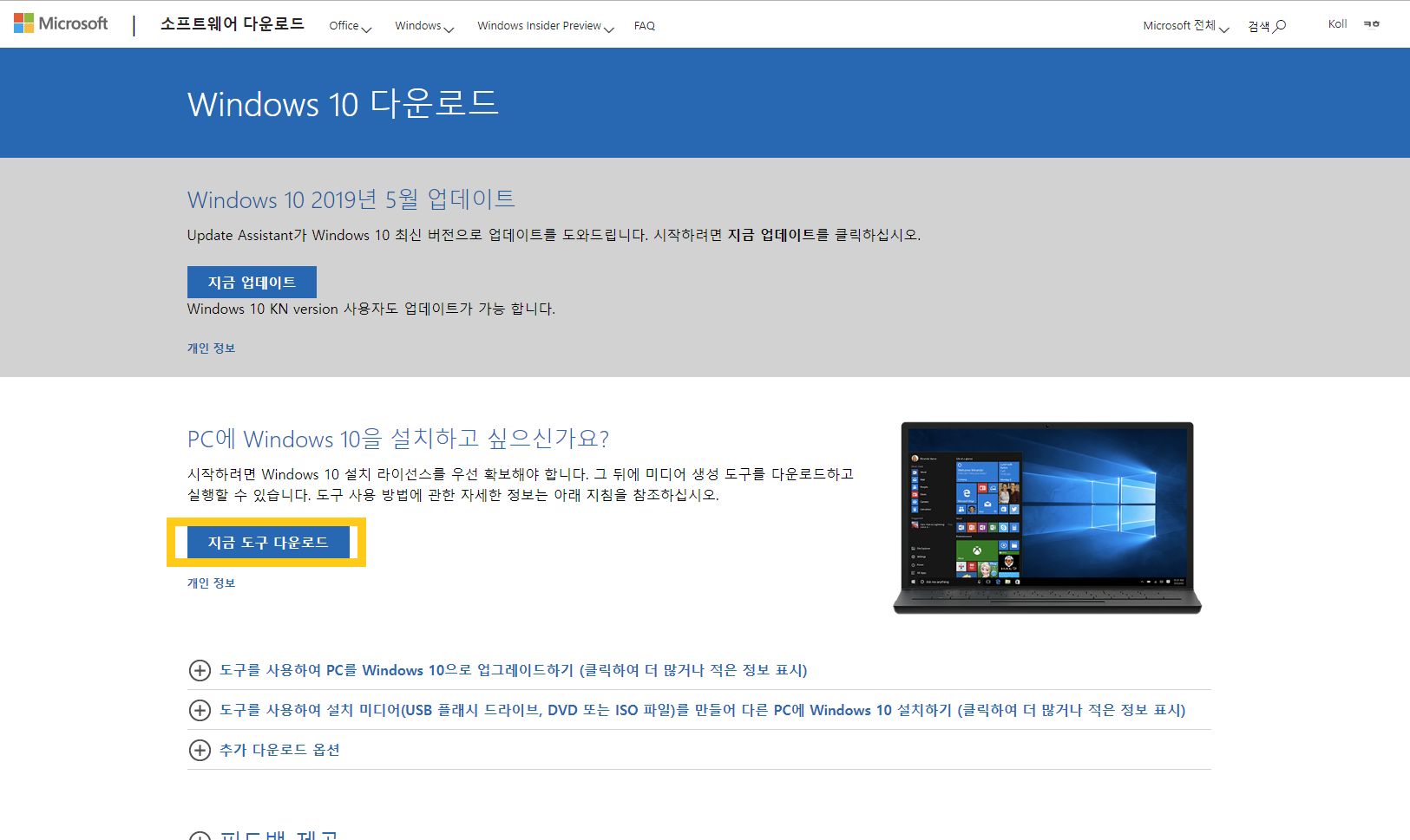 위와 같은 사이트가 나타난다. 우리는 컴퓨터를 업데이트 할 것이 아니라, ISO를 만들 것이기 때문에 '지금 도구 다운로드'를 클릭한다. 'MediaCreationTool'이 다운로드 된다.
