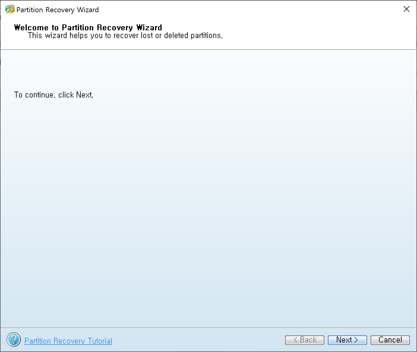 파티션 관리 도구에 파티션 복구 기능도 제공되는 것이어서 파티션 복구 위자드를 실행해야 한다.